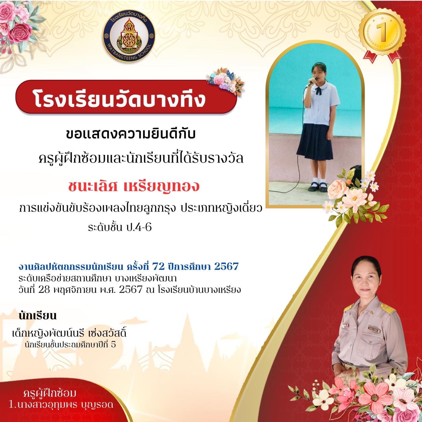 การแข่งขันขับร้องเพลงไทยลูกกรุง ประเภทหญิงเดี่ยว (เป็นตัวแทนไปแข่งขันระดับเขต